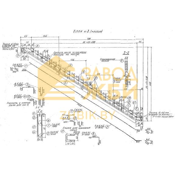 С подробным порядком производства косоуров Блок 3 можно ознакомиться в нормативном документе Серии 3.501-96. По условию регламента изготовление конструкций должно осуществляться в стальных опалубочных формах, гарантирующих точные геометрические пропорции. В качестве главного материала выступает тяжелый бетон марки М300 по прочности на сжатие с морозостойкостью минимум F200. Водонепроницаемость подбирается исходя из конкретных климатических особенностей региона строительства.