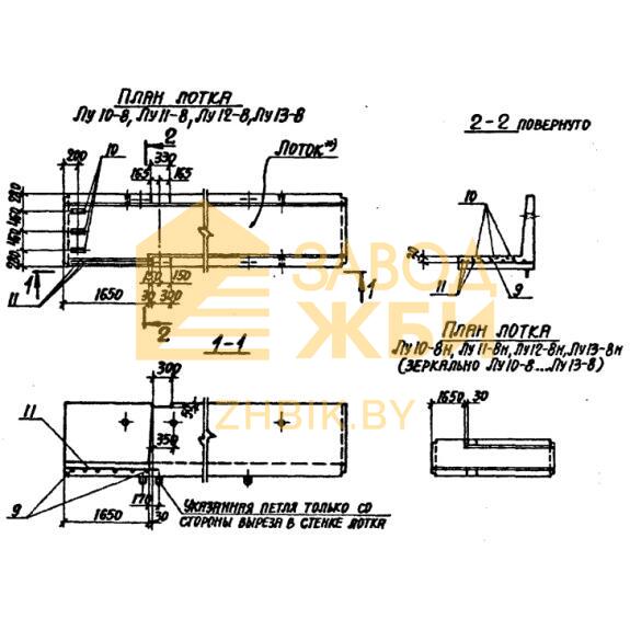 Лоток Лу 13-8 н имеет следующие габаритные размеры – 5970х1480х1320 , соответственно длина, ширина, высота в маркировке записаны в дециметрах. В обозначении также указаны следующие знаки: