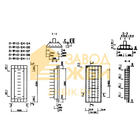 Длина ленточной плиты ПФ 10-24-07 составляет 2380 , ширина – 1000 , 300 – высота. Геометрический объем составляет 0,714 , объем бетона на одно изделие – 0,53 , масса – 1340 .
